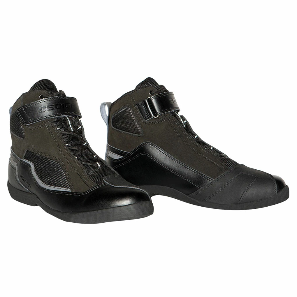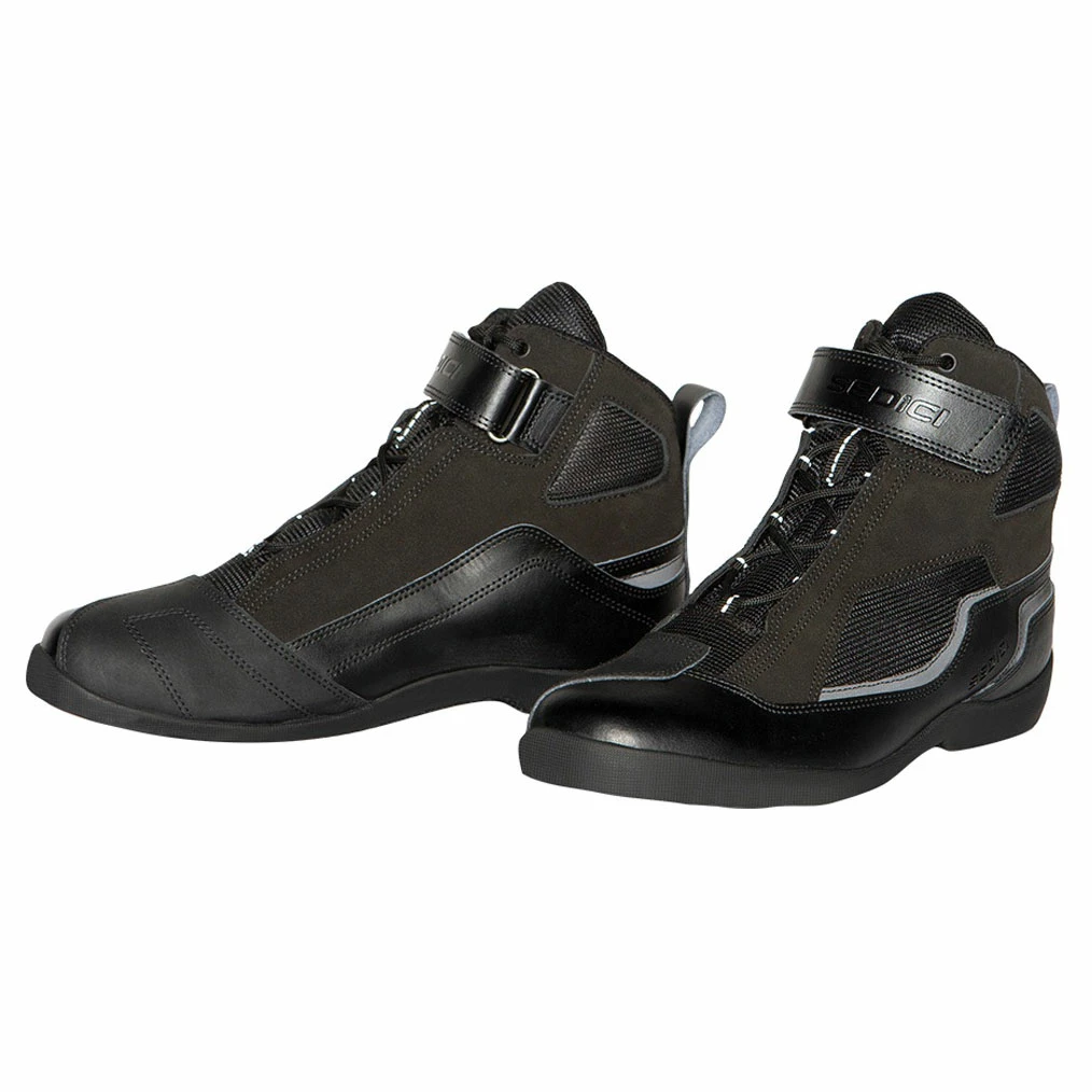 The oil resistant high traction sole contains a full length shank to provide extra support when resting on foot pegs. Reflective inserts strategically placed around the shoe light up when struck by headlights to help keep you visible at night. A lace retention systems helps keep your laces under control and a leather pull strap is a welcome detail to make it easy to pull on your boots so you can roll out.