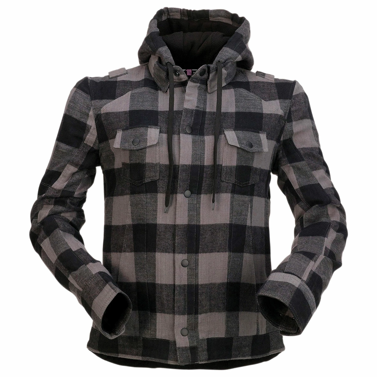 • Hidden zipper behind metal snap closures